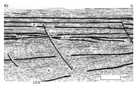Возможно, это те поперечные ответвления, о которых упоминает С.Ю.Соколов (2008). Нижние части разреза, предположительно, сложены верхнепалеозойскими терригенно-карбонатными и триас-нижнеюрскими терригенными отложениями (элсмирский комплекс), содержащими продуктивные горизонты в крупнейшем на Аляске месторождении Прадхо-Бей. Общая их мощность может достигать 6-7 км. Палеозойские и триасовые отложения, которые можно параллелизовать с элсмирским комплексом Аляски, изучены и описаны М.К.Косько и др. На склонах поднятий, разделяющих эти прогибы, мощность отложений сильно уменьшается и они выклиниваются (рис. 6).