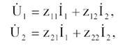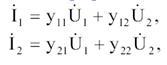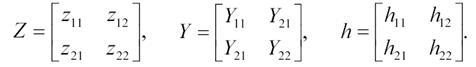 В этих выражениях слагаемое R’n , R”n – представляют собой остаточные члены разложения. Пренебрегая членами второго и более высоких порядков малости, получаем систему линейных функций двух переменных (двух аргументов) .Х1 и .Х2. Т.к. за независимые переменные (Х1 и Х2) могут быть выбраны любые две величины из четырех (двух токов и двух напряжений), то при выборе независимых переменных получим ряд возможных вариантов системы уравнений, связывающих приращения токов и напряжений. Если на постоянные составляющие токов и напряжений наложены достаточно малые синусоидальные сигналы, то их амплитуды Im и Um (или действующие значения I и U) можно рассматривать как малые приращения постоянных составляющих. При переходе от малых приращений к синусоидальным сигналам надо учитывать, что мгновенные приращения токов и напряжений представляют собой функции времени и частоты. Отношения этих величин можно охарактеризовать модулем и фазой. Частные производные в системе могут быть безразмерными и (или) размерными величинами (сопротивлениями или проводимостями). Наиболее употребительными являются следующие три пары уравнений, в которых большими символами обозначены малые приращения напряжений и токов: