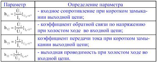 При нахождении дифференциальных параметров биполярного транзистора осуществление режима холостого хода в цепи эмиттера или базы (для схемы с общим эмиттером) достаточно просто осуществить, т.к. внутреннее сопротивление открытого перехода мало. Создание режима холостого хода в цепи коллектора (выходной цепи) затруднено тем, что внутреннее сопротивление при этом очень велико (достигает нескольких мегоОм). В связи с выше сказанным, экспериментальное определение дифференциальных параметров (z- параметров) для системы (2) затруднено. При нахождении дифференциальных параметров биполярного транзистора осуществление режима короткого замыкания (шунтирования исследуемой цепи, сопротивлением, значительно меньшим её внутреннего сопротивления) требует реализовывать питание электродов транзистора постоянным напряжением, что выполняют включением параллельно электродам соответствующего конденсатора. Такой режим легко реализовать для цепи коллектора, в которой сопротивление коллектора очень велико. Но режим короткого замыкания по переменному току в цепи эмиттера или базы (для схемы с общим эмиттером) достаточно трудно осуществить, т.к. внутреннее сопротивление открытого перехода мало (особенно на малых частотах). Всё сказанное в этом разделе свидетельствует, что применение y-параметров и системы (3) для описания свойств биполярного транзистора в режиме малого сигнала затруднено. Поэтому наибольшее применение нашла смешанная система (4), в которой используются те режимы включения биполярного транзистора по переменному току, которые возможно реализовать на практике. При этом надо реализовать режим короткого замыкания во входной цепи и режим холостого хода в выходной цепи. Физический смысл h-параметров представлен в таблице: