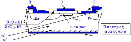В отсутствие напряжения, приложенного к затвору, р-n -переходы, образованные сильнолегированными областями р+ c подложкой, смещены в обратном направлении. В подложке на границе раздела между полупроводником и диэлектриком образуется положительный заряд подвижных дырок, который уравновешивает отрицательный заряд, образованный в случае подачи на электрод затвора положительного потенциала относительно истока ( и часто соединенной с ним подложки). Если заряд, сообщенный металлизации затвора превосходит тот, что необходим для компенсации встроенного положительного заряда поверхностных состояний и заряда, связанного в диэлектрике, то к приповерхностной области полупроводника подходят из глубины полупроводника неосновные носители заряда - дырки и формируется (индуцируется) проводящая область – канал.