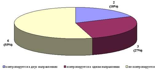 На основании данных приведенных в таблице 1.1 и на рисунке 1.1 из 11 городских автобусных маршрутов, обслуживаемых РДАУП "Автобусный парк № 1" г. Гомеля только 2 маршрута (18%) контролируется в двух направлениях, 3 маршрута (27%) — в одном направлении, 6 маршрутов (55%) вообще не контролируются.