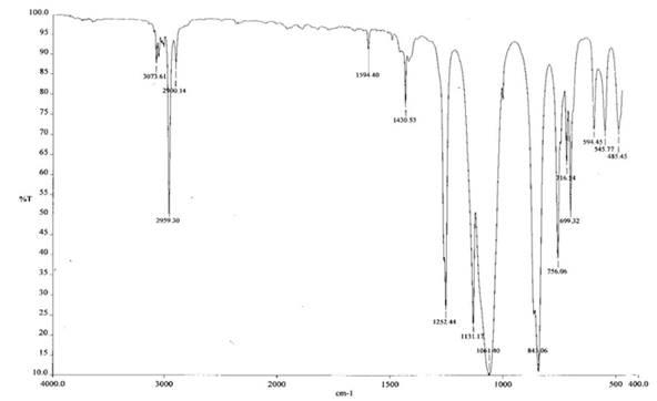 поглощение имеет относительно простую колебательную структуру, что указывает на мономерный характер полученного соединения. В этой области отсутствуют максимумы поглощения которые соответствовали бы колебаниям связи Si-O в циклических и олигомерных продуктах. Присутствует лишь полоса поглощения при 1130 см-1