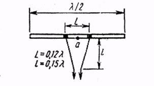 Более широкополосной является схема с шунтовым питанием (рисунок 5). Подбирая размеры L и l шунта удается в линии получить без дополнительных элементов настройки режим, близкий к режиму бегущей волны. Преимущество такой схемы еще и в том, что в середине вибратора образуется узел напряжения, что дает возможность крепить вибратор к опоре без изоляторов.