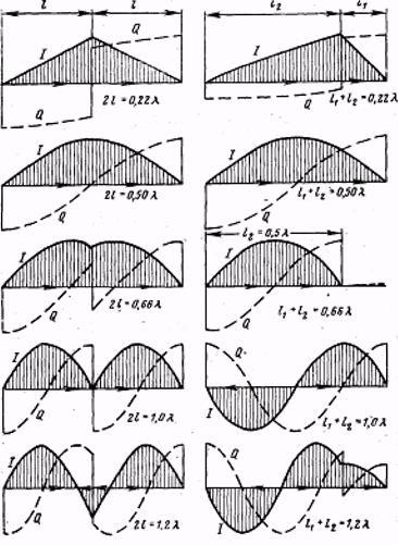 Распределения тока и заряда для тонкого симметричного вибратора приведены на рисунке 1. При 21 распределение является синфазным, а при 21 > - переменно-фазным.