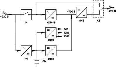 Структурная схема ИБП малой мощности: ККМ–В – корректор коэффициента мощности – выпрямитель, ИНВ– инвертор, ППН – преобразователь постоянного напряжения, ЗУ – зарядное устройство, ВИП – вторичный источник питания, АБ – аккумуляторная батарея, К1, К2 – реле блока коммутации.