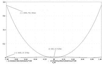 Смысл этого выражения в следующем: находятся разность выходных токов, протекающих через резисторы R22 и R23; производная от этой разности, которая нормируется по отношению к максимальному значению производной; отклонение нормированной производной от максимального значения (1) и умножается на 100 %. Такой способ оценки линейности полностью соответствует выражению (5а), полученному аналитическим путём.