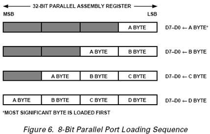 Для этого, в течение четырех циклов записи во входной 32-разрядный регистр (32-BITPARALLELASSEMBLYREGISTRY) побайтно (из порта B контроллера) записывается код. После каждого цикла записи = 0.