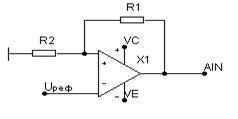 подается на вход АЦП (AIN) через неинвертирующий усилитель с коэффициентом передачи: