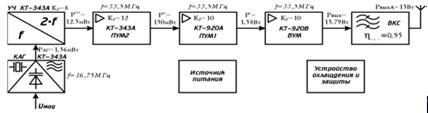 . При меньшей нестабильности передатчики реализуются по многокаскадным схемам. Количество каскадов усиления определяется из условия обеспечения заданного уровня выходной мощности. При этом оконечный усилитель мощности (УМ) называют выходным (ВУМ), а все остальные – промежуточными (ПУМ). За фильтрацию отвечают колебательные системы каскадов (КС), в основном – оконечного (ВКС).