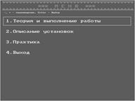 После выбора первого раздела меню “Теория и выполнение работы”, управление передается соответствующей подпрограмме которая показывает внешний вид установки. Результат работы показан на рис.2.