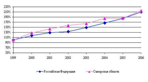 Начиная с 2000 года, в Самарской области происходил устойчивый рост инвестиций в основной капитал. В 1999-2006 годах прирост инвестиций (в сопоставимых ценах) составил почти 115% - это несколько выше, чем в целом по Российской Федерации (114%) и ПФО (111%) (рис. 1).