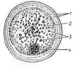 На рисунке 2А показана икринка осетровых, состоящая из многослойной оболочки(1) и желточной массы с жировыми капельками. На рисунке2Б изображена созревшая икринка осетровых, имеющая оболочку (1), желточную массу (2), жировые капли (3), зародышевый пузырек (глазок).