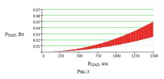 На рис.3 показана зависимость требуемой мощности передатчика помех от расстояния до РЛС, при имитации цели находящейся на максимальной дальности(Rmax