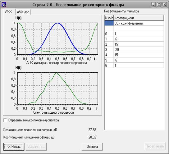 Для подавления пассивных помех, действующих на РЛС будет использован режекторный фильтр, а именно линейный режекторный фильтр с симметричными весовыми коэффициентами, который реализуем при помощи программы «Стрела».