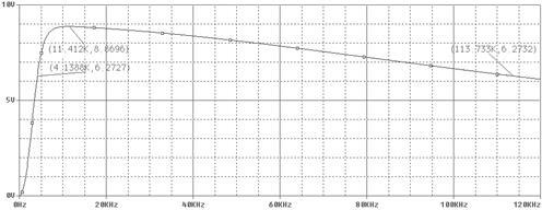 Построив АХЧ фильтра, видим, что он применим до частоты 114 кГц. Так как это верхняя частота для данной схемы. Именно поэтому был исключён четвёртый блок в схеме замещения для большого сигнала.