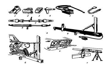 Правку аварійних кузовів і кабін виконують на стендах (рис. 3) з допомогою комплекту пристосувань (рис. 4). Зусилля розтягування й стискування створюються робочими циліндрами 1, 3 (рис. 3), у яких рідина йде від насоса. Для правки кузов 4 встановлюють на підставки 6, що закріплені на фундаментній рамі 2. На підставки спираються силові поперечні труби, які губками затискачів закріплюють за ребра жорсткості порогів кузова. Кріплення останнього до рами виконують пристосуваннями 5. Попередньою правкою усувають глибокі вм'ятини, вигини і перекоси. Позаяк у процесі правки можуть утворитися тріщини чи розриви, які надалі потрібно ліквідувати, правку проводять перед зварювальними роботами.