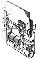 На изоляционном рычаге укреплен сдвоенный держатель 7 (рис. 2) с двумя контактами 5, имеющими притирающие пружины 6. При включении контактора подвижные контакты касаются двух неподвижных контактов 1, укрепленных на стойке 2 через держатели 3. Между контактами находится асбестоцементная перегородка 4. При разрыве силовой цепи электрических печей образуются две небольшие дуги, которые растягиваются под действием потока теплого воздуха, охлаждаются окружающим воздухом и гаснут.