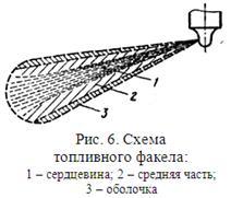 Обычно в факеле (рис. 6) различают три зоны: сердцевину, среднюю часть и оболочку. Сердцевина состоит из крупных частиц топлива, которые имеют наибольшую скорость движения. Средняя часть факела содержит большое количество мелких частиц, образовавшихся при дроблении передних частиц сердцевины силами аэродинамического сопротивления. Распыленные и потерявшие запас кинетической энергии частицы топлива оттесняются и продолжают движение лишь за счет потока воздуха, увлекаемого попутно факелом. В оболочке находятся наиболее мелкие частицы, имеющие минимальную скорость движения.
