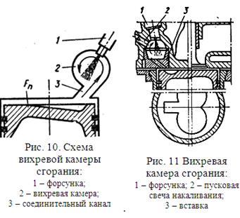 Вихревая камера сгорания (рис. 10) представляет собой шаровое или цилиндрическое пространство, соединенное с надпоршневым пространством цилиндра тангенциальным каналом. Объем VK