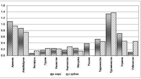 Насамперед відзначимо, що для одних країн меншої виявляється волатильність курсу стосовно рубля, тоді як для інших - до євро. Країни СНД можна умовно розділити на три групи. Перша група - це країни, що характеризуються досить високої волатильністю обмінного курсу національної валюти стосовно рубля, серед яких Азербайджан, Вірменія й Туркменістан. У другу групу з відносно низкою волатильністю курсу входять такі країни, як Бєларусь, Грузія, Казахстан, Киргизстан і Молдова. В інших країнах волатильність обмінного курсу близька до середнього. Якщо розглянути курс до євро, то розбивка країн по групах практично не міняється. Виключення становлять Узбекистан (низька волатильність) і Україна (відносно висока волатильність).