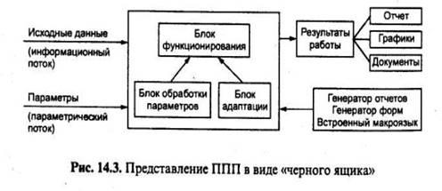 При проектировании ЭИС на основе параметрической настройки пакета прикладных программ (ППП) последний рассматривается как "черный ящик" (рис.14.3). На вход ППП подаются параметрический (ПП) и информационный (ИП) потоки, а выходом служит результат работы пакета (РЩ ППП включает следующие блоки: функционирования, обработки параметров, адаптации.
