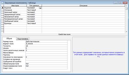 1. Создать таблицу «Закупаемые компоненты» при помощи Конструктора и задать имя, тип, размер, формат каждого поля таблицы