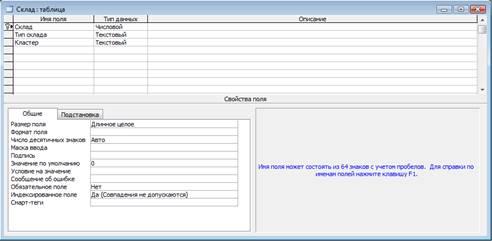 Рисунок 3 – Таблица «Склад» в режиме Конструктор