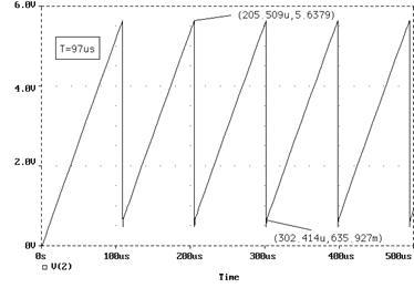 Результаты моделирования схемы генератора пилообразного напряжения, приведённые на рисунке 42, довольно хорошо согласуются с расчётными аналитическими выкладками.