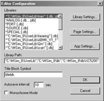 В верхней части меню команды EditorConfiguration в окне Libraries приведён список подключённых библиотек символов компонентов (с расширением.slb), а в строке LibraryPath – путь доступа к библиотекам.