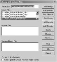 Подключение текстовых библиотек компонентов с расширением.lib выполняется по команде Analysis/LibraryandincludeFiles –открывается меню, приведённое на рисунке 3б. Дальнейший порядок действия аналогичен подключению библиотек символов.