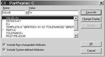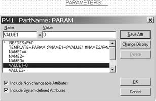 Символ «*» слева от имени атрибута означает, что этот атрибут нельзя редактировать в режиме рисования схем (только в режиме редактирования символа). Чтобы сделать этот атрибут доступным для редактирования в режиме рисования схемы, необходимо войти в режим редактирования символа (пиктограмма ), выполнить команды Part/Attributes и установить флаг в окне Changeableschematics.