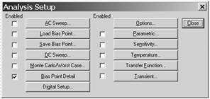 Перед проведением моделирования составляется задание на моделирование по команде Analysis/Setup или при нажатии пиктограммы . В открывшемся окне (рис. 7) нажатием курсора отмечают нужные директивы моделирования (при этом в графе Enabled появляется флаг). После нажатия соответствующей кнопки открываются диалоговые меню задания директив моделирования.
