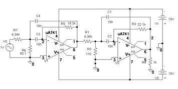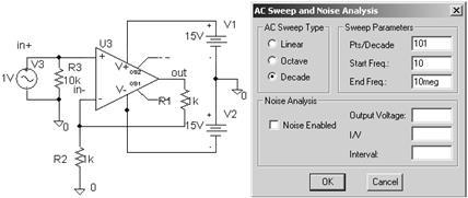 Особенности моделирования схемы на переменном токе приведём на примере исследования усилителя напряжения на операционном усилителе μА741 (рис. 39).