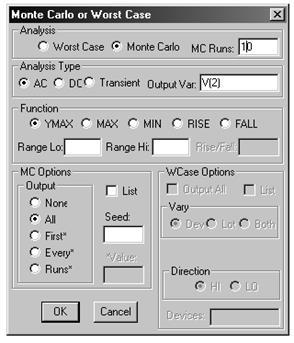 Вариация параметров назначается по заданию Parametric. На каждом шаге вариации параметров по очереди выполняются все виды анализа характеристик цепи. Варьироваться могут все параметры всех моделей компонентов и глобальные параметры, за исключением: параметры L и W МОР-транзистора; температурные коэффициенты резисторов и других компонентов.