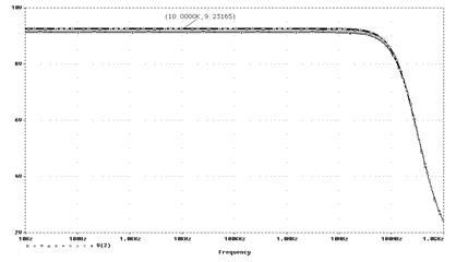 Обратите внимание на то, что характеристики построены в логарифмическом масштабе. В этом случае выражение DB(V(out)) означает, что на экран выведен график АЧХ усилителя (кривая, отмеченная знаком), охваченного ООС АЗ