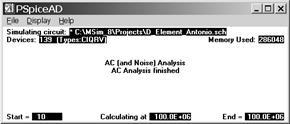 Расчёт характеристик в частотной области производится после определения режима по постоянному току и линеаризации всех нелинейных компонентов. Все независимые источники напряжения и тока, для которых заданы значения АС-амплитуды и фазы, являются входными воздействиями.