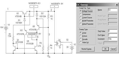 Далее приступают к моделированию. Задав вариацию напряжения источника V1, убеждаются в работоспособности СН, проверив его статический режим при начальных условиях, затем приступают к построению графиков в программе Probe.