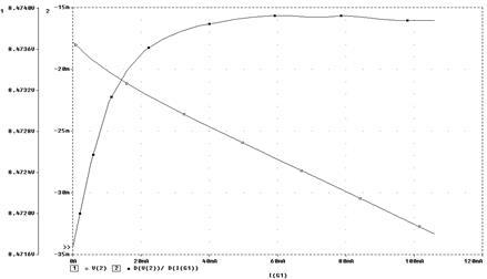 Далее, задав вариацию источника V2, можно построить график зависимости выходного напряжения СН от изменения напряжения в узле 10, а затем произвести замену переменных – по оси Х будет откладываться ток через зависимый источник тока G1 (рис. 38).
