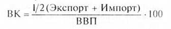 • внешнеторговая квота определяется как соотношение совокупной стоимости экспорта и импорта, деленной пополам, к стоимости ВВП в процентах: