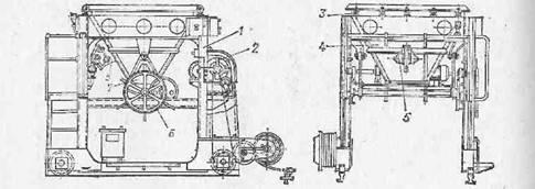 1 — рама на колесах; 2 — приводной механизм; 3 — амортизатор; 4 — бункер; 5 — вибратор-побудитель; 6 — штурвал; 7 — секторный затвор