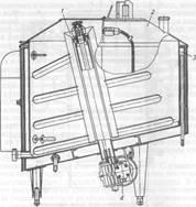 Рамная лопастная мешалка расположена перпендикулярно наклонному дну ванны. Привод вала мешалки расположен в нижней части ванны на наклонном днище. Наклон лопастей рамной мешалки и наклонное расположение ее оси вращения обеспечивают интенсивное перемешивание продукта и равномерное распределение влаги по всей ванне при нормализации.