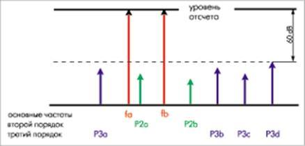 |. На практике проводят оценку продуктов искажения только двух первых порядков (остальные гармонические составляющие резко убывают по амплитуде) - IMD2 и IMD3. Сумма коэффициентов n и m (они принимают значения 0, 1,2) определяет порядок искажений. Например, P2a = fb