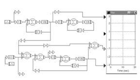В верхней части модели расположен формирующий фильтр: одно- и двухзвенный, а в нижней части – оптимальная система для задающего воздействия, сформированного однозвенным фильтром.