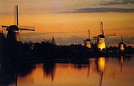 Это и тихая, зеленая, плоская страна. Несмотря на то, что на карте мира она занимает крошечное пространство, едешь по ней - и куда-то далеко-далеко за горизонт, за край низкого и влажного приморского неба уходят поля и луга, тополиные перелески, цветочные плантации. Мелькают мельницы - и старинные, и сверхсовременные ветряки, добывающие электроэнергию. Позади остаются чистенькие городки и деревни с маленькими разноцветными домиками, пасутся на "польдерах" - осушенных морских заливах - тучные голландские коровы. Вся земля пересечена дамбами и каналами, и производит удивительное впечатление, если даже много раз уже видел это в кино, зрелище большого корабля, движущегося по каналу, находящемуся выше уровня земли.