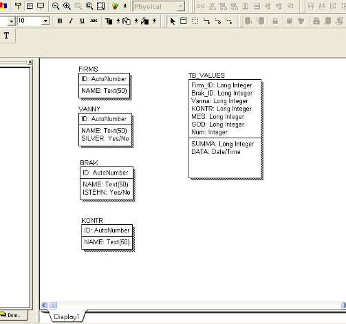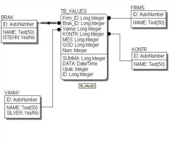 Таблица TB_VALUES будет содержать записи, отражающие данные актов возврата бракованной продукции. Одним из полей её будет целое число – NUM (номер акта). Далее поля связанные со справочниками, хранящие данные фирма, вида брака, тип ванны, ФИО контролёра. Следующие поля – DATA (дата составления акта), MES (месяц) и GOD (год) составления акта (необходимы для формирования групповых отчётов по годам и месяцам), а так же SUM (количество ванн с данным видом брака по текущему акту).