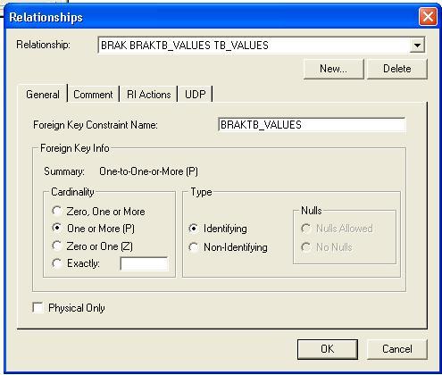 Далее необходимо определить связи между сущностями. Все таблицы-справочники будут связаны с таблицей TB_VALUES связью один-ко-многим, так как каждой уникальной записи в справочнике соответствуют многие записи в таблице TB_VALUES. Для создания связей необходимо воспользоваться инструментом Relationship среды ERWin. Необходимо создать отношения каждого справочника к таблице TB_VALUES. В настройках Relationship Properties для каждого отношения установить свойство отношения Cardinality в «One or More». Пример показан на рис. 3.2.