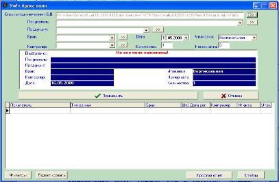 3.2 Разработка приложения ввода данных в Borland Delphi 7 В среде Borland Delphi 7 необходимо создать новое приложение, сохранить его в специально созданную папку. Для работы с БД будут использоваться компоненты с закладки на палитре компонентов «ADO», реализующие доступ к данным на основе технологии ADO (Microsoft ActiveX Data Object). Так же будут использованы стандартные компоненты и компоненты связи и отображения данных (TDataSet, TDBGrid, TDBLookupComboBox). Особо следует обратить внимание на использование специально разработанного для переноса данных MS EXCEL компонента TLIP_Excel. Он реализует самые необходимые свойства и методы для открытия заготовки отчёта, получения данных из ячеек и возврата данных в ячейки. Полный исходный текст компонента см. в приложении. Рабочее окно проектирования приложения показано на рис. 3.5 Рис 3.5 Отдельного внимания заслуживает алгоритм соединения с БД. Он использует метод класса TADOConnection – ConnectionString. Метод открывает стандартное окно Windows связи с поставщиком данных и возвращает строку типа WideString, содержащую необходимые параметры соединения. Для использования метода необходимо подключить модуль AdoConEd (в строке uses). Для фильтрации возвращаемого и отображаемого в DBGrid набора данных служит форма «Фильтры». Она вызывается нажатием одноимённой кнопки на главной форме. Вид формы на этапе проектирования показан на рис. 3.6 Рис 3.6 В соответствии с выбранными параметрами впоследствии корректируется запрос к БД. Затем он выполняется и отфильтрованные данные отображаются в DBGrid, а так же могут быть напечатаны по нажатию кнопки «Простой отчёт». 3.3 Разработка системы создания отчётности в MS EXCEL Параметры соединения, а так же алгоритм соединения с БД в программе Reporter целиком взяты из программы Brak. Независимо от того в какой из программ получена строка соединения с БД, впоследствии она запоминается в системном реестре операционной системы и используется при последующих вызовах обеих программ. Программа реализует выбор файлов-заготовок при помощи TOpenFileDialog и затем по нажатию кнопки запускает цикл просмотра файла-заготовки, создания запросов на основе прочитанных строк и возврат данных из запроса в исходные ячейки.Вид формы на этапе проектирования показан на рис. 3.7 Рис. 3.7 4. Технологическая часть 4.1 Инструкция системного программиста Требования к аппаратному и программному обеспечению:· ПК с процессором не ниже Pentium2· ОЗУ не менее 128 МБ· Принтер· ОС Windows · Установленный пакет MS Office (как минимум MS Excel)Установка программы:Необходимо создать на жёстком диске компьютера отдельную папку программы, скопировать в неё файлы KZDB.mdb, Brak.exe, Reporter.exe, а так же файлы - заготовки отчётов (с расширением .xls).Первый запуск.При первом запуске программы Brak.exe или Reporter.exe необходимо выполнить соединение с базой данных KZDB.mdb.