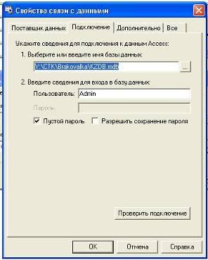Рис 4.1Для этого справа от поля ввода «Строка подключения к БД» нажать кнопку смены параметра «>>». См. рис. 4.1. При этом откроется стандартное окно изменения строки подключения к БД MS ADO. См. рис. 4.2 Рис 4.2 В этом окне необходимо нажать кнопку «Build», для выбора новой БД.Далее в предложенном списке поставщиков данных выбрать Microsoft Jet 4.0 OLE Provider, а на закладке «подключение» выбрать нужную БД (файл KZDB.mdb). См. рис 4.3. Пароль для БД должен быть пустым, пользователь - Admin.программа ввод информационный система Рис 4.3После того как подключение создано, можно его проверить с помощью кнопки «проверить подключение» на той же вкладке, затем нажать кнопку «ОК».В результате строка подключения АDO запоминается приложением, она будет записана в ветке реестра Windows «HKEY_CURRENT_USER\Software\Brak». Необходимо помнить, что эта настройка будет сохранена только для текущего пользователя операционной системы. При смене пользователя настройку строки подключения необходимо повторить. На этом настройки приложений заканчиваются.Язык заготовок отчётов в MS EXCEL.Для того чтобы получать отчёты из БД в MS EXCEL создаются заготовки отчётов. Эти заготовки в последствии открываются программой Reporter, заполняются необходимыми данными для дальнейшей печати и анализа. В заготовках, в соответствующих ячейках, в которые затем должны быть выведены данные, располагаются запросы к БД. Запросы представляют собой обычные запросы языка SQL к БД KZDB.mdb, но и к тому же дополнены служебными символами:### - префикс запроса, далее следует запрос на SQL. Пример : ### SELECT sum(summa) as val1 from Values_all where brak_id=15 and mes=1 and god=2008. В ячейку с этим текстом будет возвращена сумма ванн за первый месяц (январь) 2008 г. С определённым типом брака.Кроме того можно передать и другие параметры:#DATE# - данные за дату, которая указана в календаре в программе Reporter #DATE_NM# - дата начала месяца, указанного в календаре в программе Reporter '#NACHMES# - дата начала месяца для текущего времени операционной системы. #NOW#' – текущая дата из операционной системы.С помощью этих параметров можно составлять запросы для заранее неопределённых периодов времени. Например, следующий запрос вернёт в ячейку сумму бракованных ванн за период от начала текущего месяца до текущей даты:### SELECT sum(summa) as val1 from Values_all where Data>='#NACHMES# and Data<=#NOW#.Таким образом достигается гибкость создания отчётов. Заготовки можно создавать не изменяя исходный код программы. 4.2 Инструкция пользователя Добавление данных из актов о возврате продукции.Для добавления данных из актов о возврате продукции необходимо запустить программу Brak.exe. Откроется окно показанное на рис. 4.4. Рис. 4.4 В соответствующие поля внести данные из актов: покупатель, продукция, тип брака, дата составления акта, номер акта, количество ванн с браком данного типа по акту, ФИО контролёра ОТК. Если данных нет в выпадающем списке (например новая фирма-покупатель) их необходимо добавить нажав кнопку «>>» справа от поля ввода. При этом следует помнить, что программа не может проверить уникальность названий при неполном совпадении символов в названии. Так названия фирмы ООО«Интерскол» и ООО «Интерскол» из-за добавления пробела будут восприниматься программой как разные фирмы. За этим необходимо следить! Когда все данные набраны можно нажать кнопку «применить» и все данные попадут в БД. Для того чтобы можно было просмотреть данные по уже введённым ак