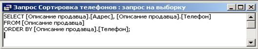 Оператор SELECT создает требуемую таблицу, с помощью FROM перечисляются таблицы, содержащие необходимые для выполнения запроса данные, FROM – оператор сортировки по возрастанию. Этот запрос можно описать так: создать таблицу со столбцами “адрес” и “телефон”, сортируя таблицу “телефон” по возрастанию.