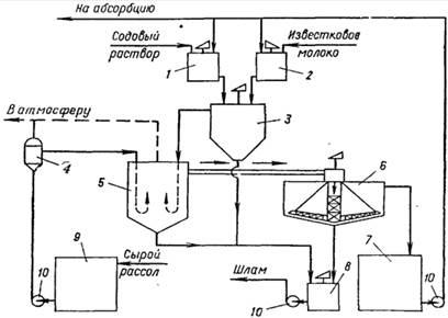 с. Реактор з'єднаний трубопроводом з відстійником 6. Суспензія надходить зверху у відстійник і по центральній трубі, що не доходить до дна, опускається вниз. Потім розсіл піднімається нагору, відокремлюючись від твердої фази. Прояснений розчин видаляється з відстійника через переливний жолоб, розташований по периферії. Шлам з нижньої частини відстійника через спеціальні труби періодично спускається в збірник (шламову мішалку) 8; сюди ж надходить шлам з реактора 5. Прояснений розсіл з відстійника 6 направляється в збірник 7 і далі насосом 10 – на абсорбцію. У мішалці 8 шлам розбавляється водою і насосом 10 перекачується в шламопроводи дистилерної рідини.